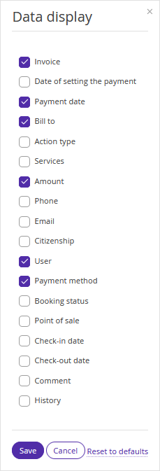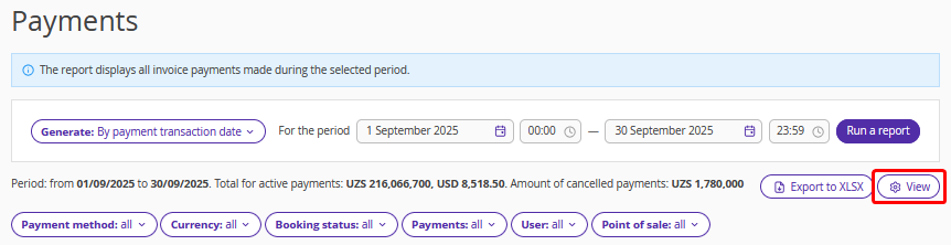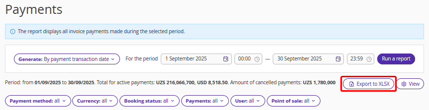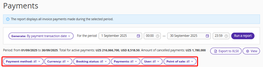 2. Set filters of payment methods, currencies, booking and payment statuses, and point of sale. If you need to see all the actions performed by a certain employee, select a user.