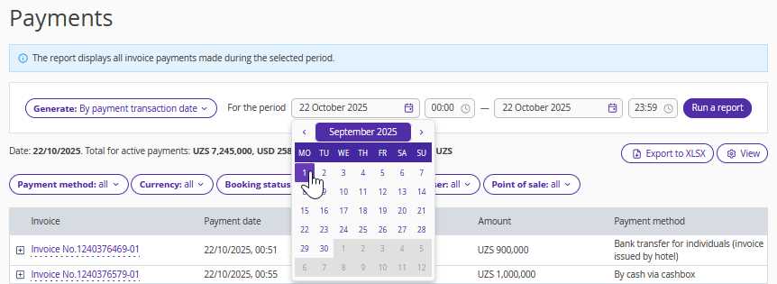 The "Payments" report contains all the payments reported in Exely PMS within a selected period.