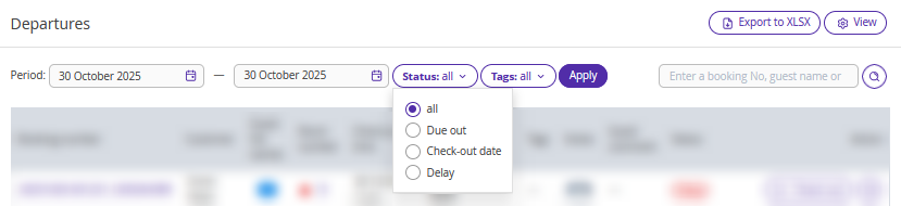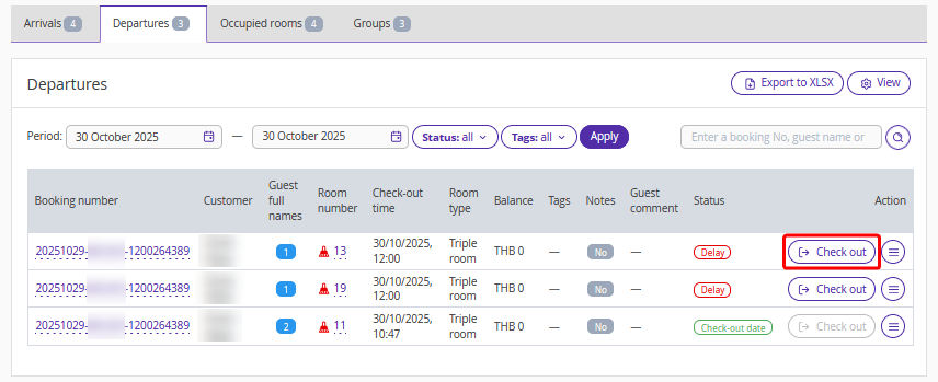 The “Departures” tab displays bookings with check-outs scheduled for the selected date. To check guests out, click the “Check out” button.
