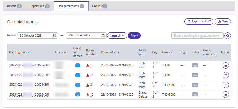 In the “Occupied rooms” tab, you can find bookings that have been checked in already, but have not been checked out yet.