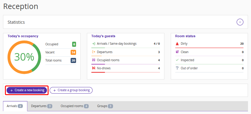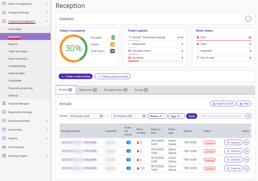 Reception is a section for managing bookings. It displays a table with all reservations, including arrivals and departures.