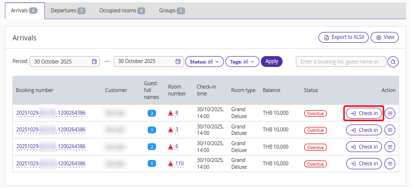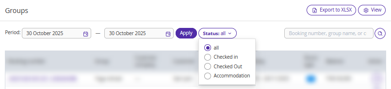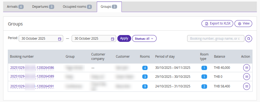 The “Groups” tab displays group bookings with stays on the selected dates. Here, you can check guests in or out for group bookings and view the list of guests in each group. For more details, see the article.