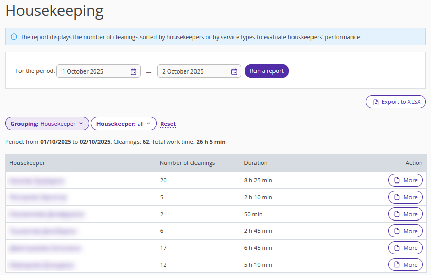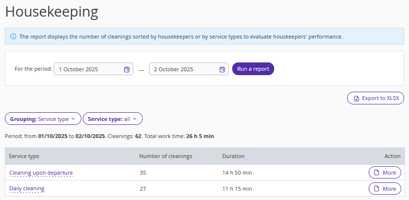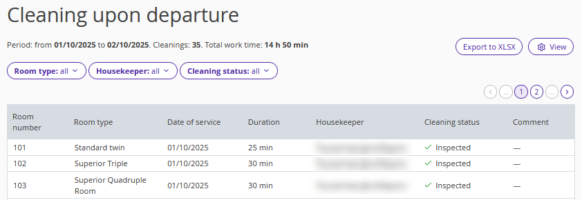 The “Duration” values are derived from the “Room service types” reference. If the cleaning was completed within less than an hour, it is displayed in minutes. If the time exceeds an hour, it is displayed in hours. Depending on the grouping, the total time is calculated as a sum of all cleanings of the specific service type or all cleanings done by the specific housekeeper.