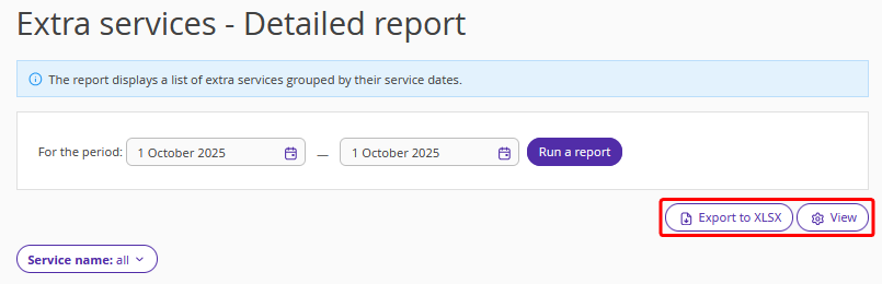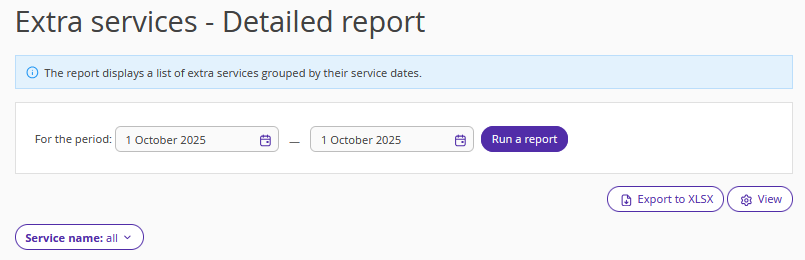 The "Extra services — Detailed" report contains a list of extra services grouped by date of provision.