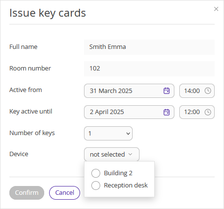 If there are several reception desks (computers) with different encoders in your property, an administrator can issue a key by selecting the required encoder in the "Device" field. By default, the system will suggest the last used device.