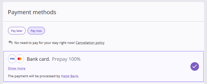 You can connect Exely partners' acquiring to Exely Booking Engine, so that guests can pay for their stay and extra services with a bank card on the property’s website. In the Booking Engine, the payment method is displayed as follows: