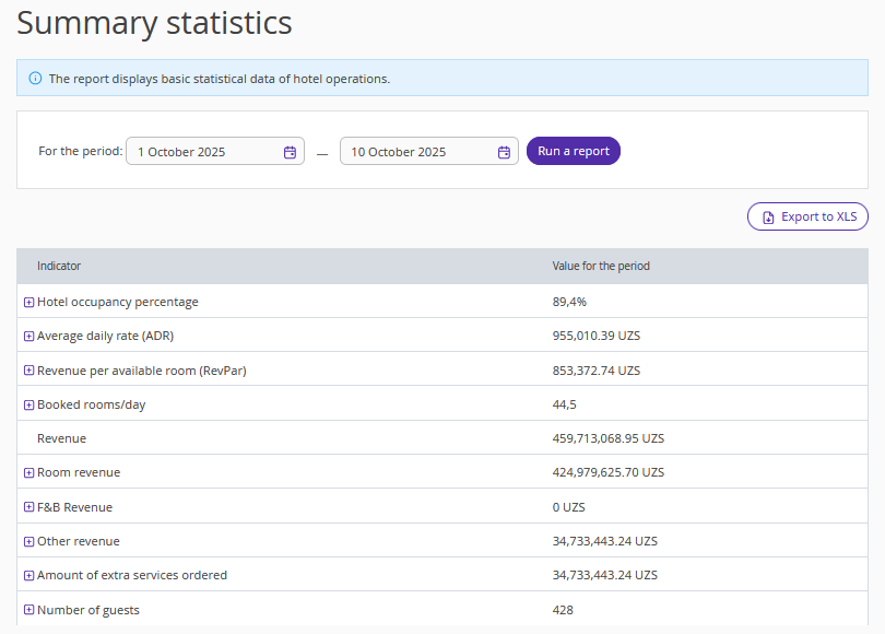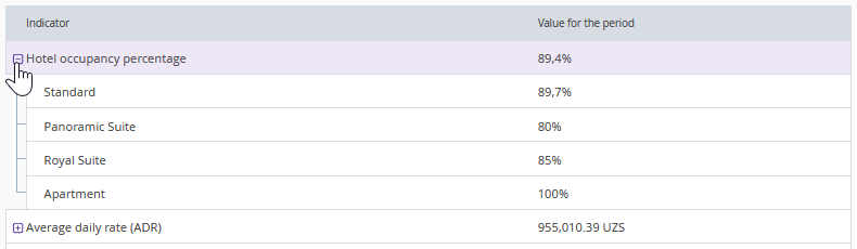 To view details, click the "+" icon next to the required indicator — a list of room types or services will be opened, displaying the value for each room type/service for the selected period.