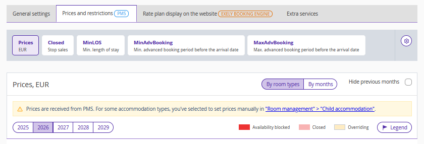 The mixed price management mode is relevant for properties when there is no possibility to automatically upload prices for all accommodation types between the property PMS and Exely. Usually, such types include extra beds and child accommodation.