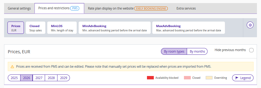 In this mode, prices can be managed both on the PMS side and on the Exely side. It is possible to change, set, and extend prices in Exely on the "Prices and restrictions" tab.