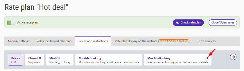 11. To adjust the parameters specified when creating the rate plan, such as the length of stay and the validity period of the rate plan, go to the "Prices and restrictions" tab. Depending on the selected options, different restrictions will be active: Closed, MinLos, etc. Active restrictions are marked with a dot. Detailed instructions on how to set or remove restrictions are described in the article "How to set up rate plan restrictions".