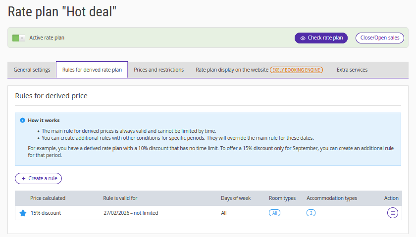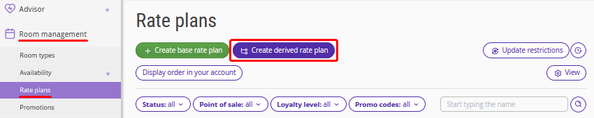 1. In the Exely extranet, go to “Room management” > “Rate plans” and click the “Create derived rate plan” button.