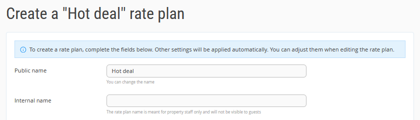 3. Fill in the rate plan details. By default, the rate plan is named "Hot deal", you can change it if needed. Specify the internal name as well.