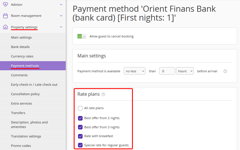 5. Enable the payment method for the required rate plans. For this, in the “Property settings” > “Payment methods” section, click the required payment method name. In the “Rate plans” section, tick check-boxes for the required rate plans and save.