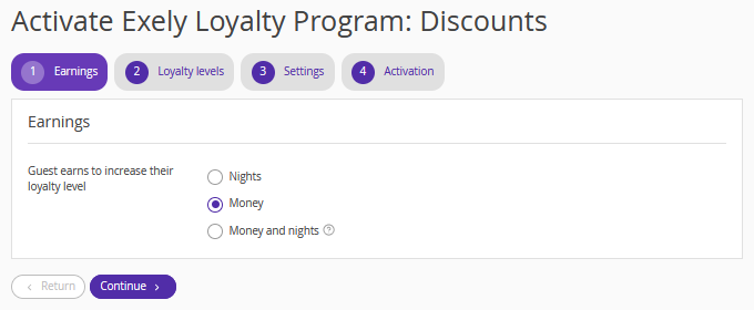 Money and nights — the guest's loyalty level will change once they have earned a certain number of nights or spent a set amount of money, whichever occurs first.