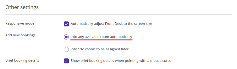 In the “Other settings” section, find the “Add new bookings” setting and select “into any available room automatically”.