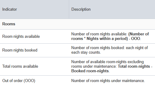 • Out of order (OOO) — number of room nights under maintenance. Each room night of each room out of order counts.