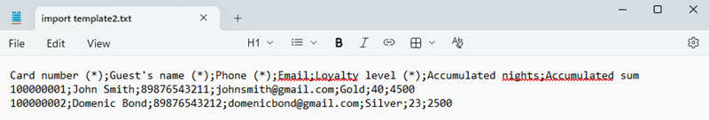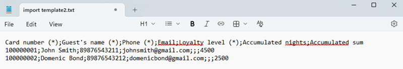 3. Download the template and fill it in following the example. The first line must always start with the following values: Card number (*); Guest’s name (*); Phone (*); Email; Loyalty level; Accumulated nights; Accumulated sum. Fields marked with "*" are required.
