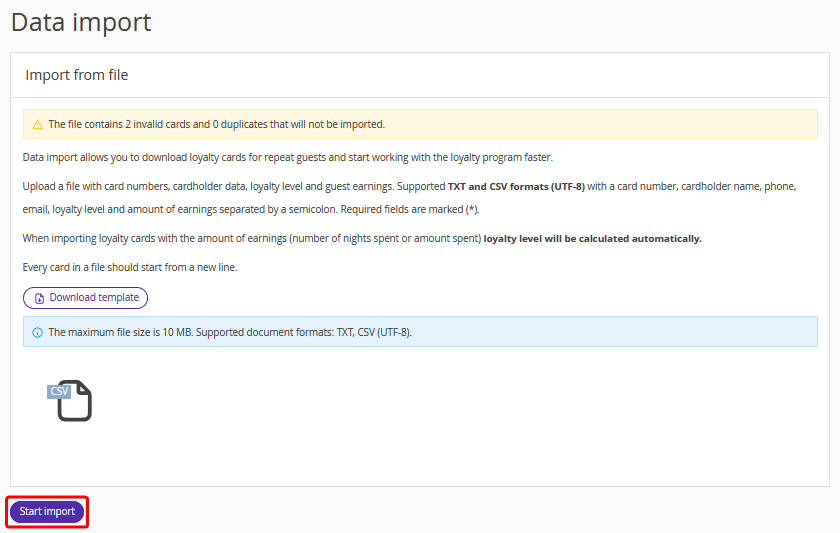 The "Import from a file" feature allows you to upload loyalty cards of returning guests and start working with the loyalty program faster.