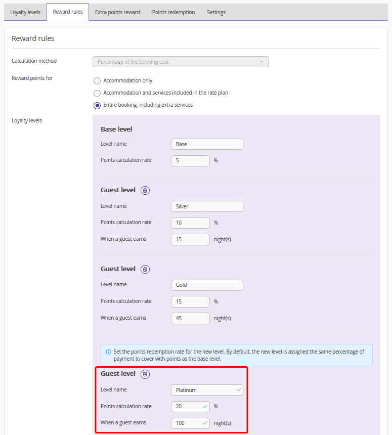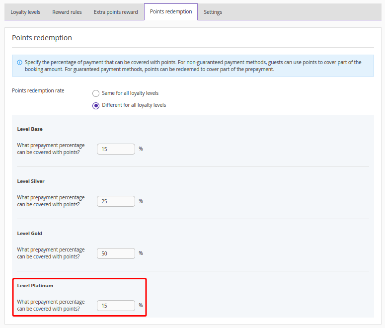 In the “Points redemption” tab, specify the prepayment percentage that can be covered with points in the booking engine: