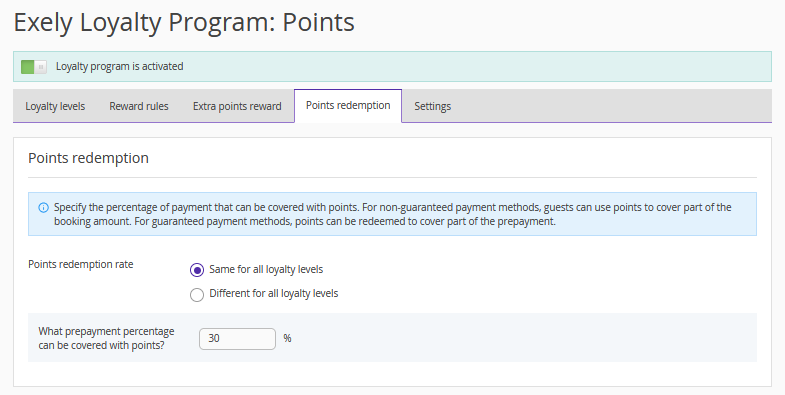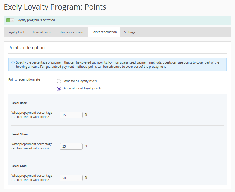A new option has been added to the Exely extranet for the properties using Exely Loyalty Program: Points — now the properties can specify the prepayment percentage that can be covered with points. This can be the same percentage or a different percentage, depending on the guest's loyalty level.