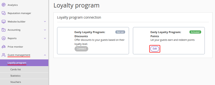 In the Exely extranet, go to “Guest management” > “Loyalty program” and click “Edit” for Exely Loyalty Program: Points.