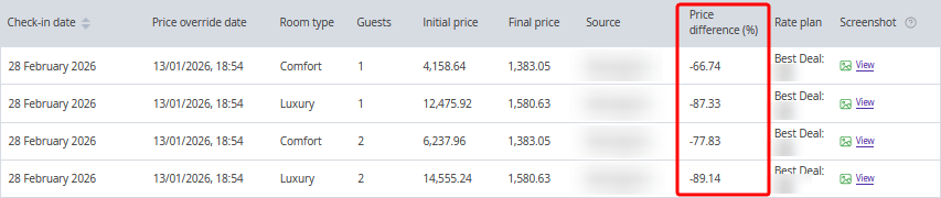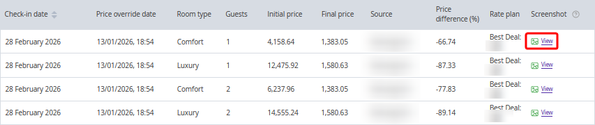Click the image icon in the “Screenshot” column to see the OTA page where the price was taken from for a price overriding. For more details, see the article “How to view price source in Rate Match”.