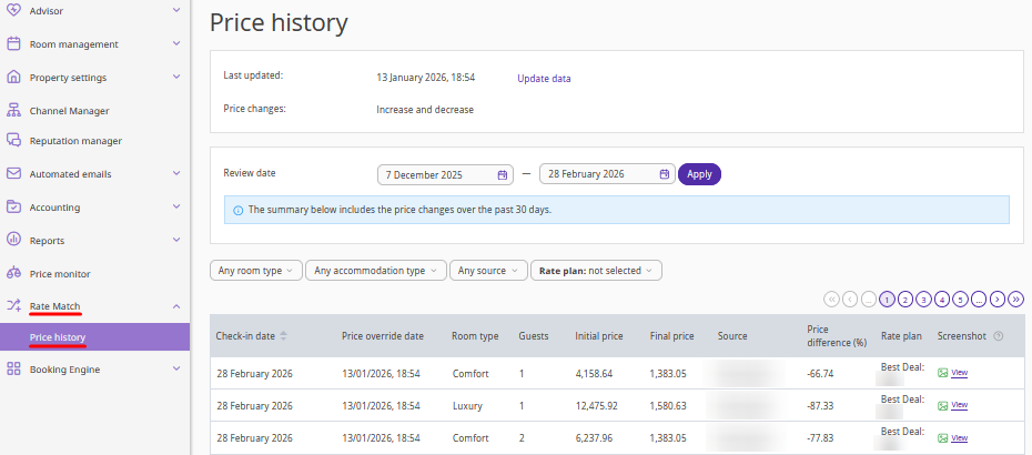 The table includes the price changes for the past 30 days. For a more detailed analysis, use the filters by room type, accommodation type, source, rate plan and review dates (the check-in dates for which prices were changed).