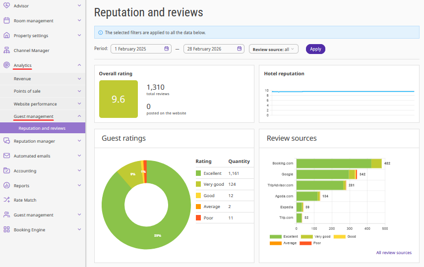 • Guest management — contains the "Reputation and reviews" report, which allows you to analyze the rating dynamics of your property based on reviews from different sources.