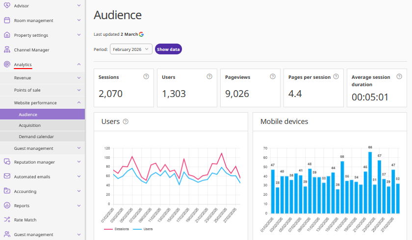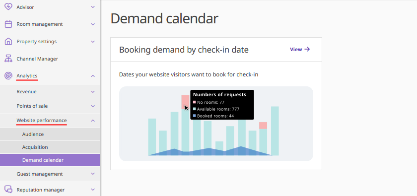 • Website performance shows the statistics of user sessions on the property’s website, as well as traffic sources statistics for a selected period. From this section, you can also open the "Demand calendar" report in Exely Advisor by clicking the "View" button.