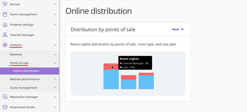• Points of sale — provides information collected in Exely Advisor on sales broken down by sources. To view the data, click the "View" button.