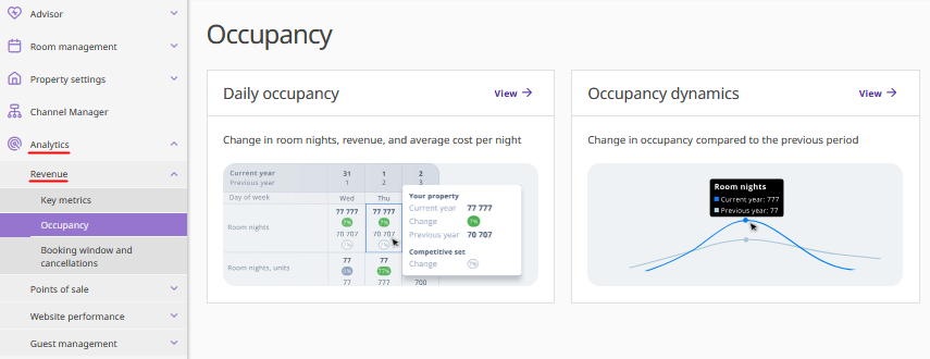 • Revenue — combines reports on occupancy rate and dynamics, booking window, and cancellations that are available in Exely Advisor. You can open the report pages by clicking the "View" button.