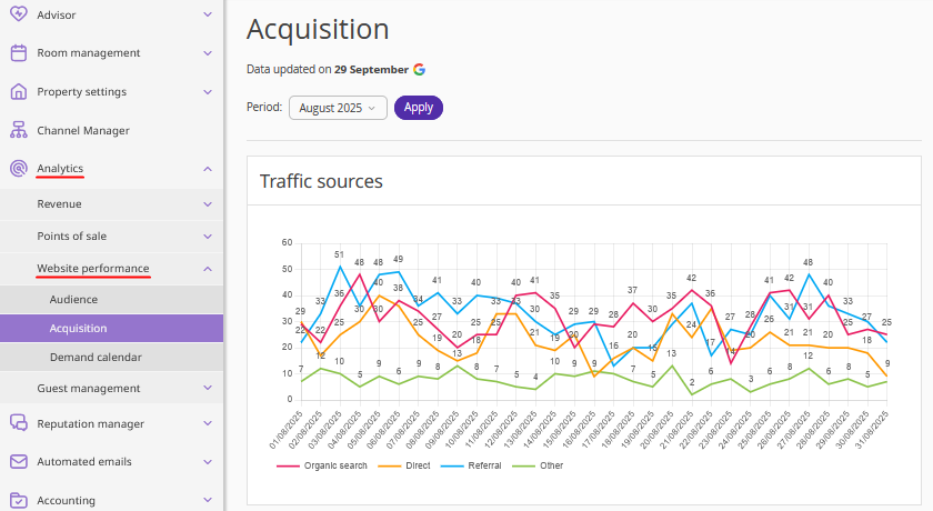 In the Exely extranet, the “Analytics” > “Website performance” > “Acquisition” section displays traffic source statistics for the selected period — including visits, traffic distribution, landing pages, and more.
