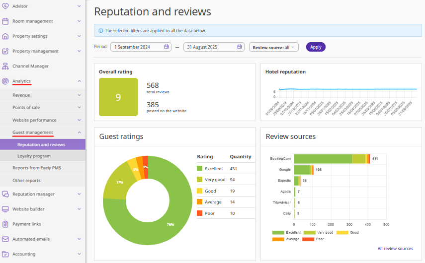 1. In the Exely extranet, go to “Analytics” > “Guest management” > “Reputation and reviews”.