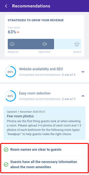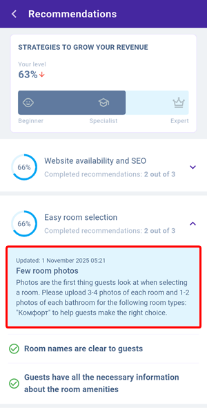 The “Recommendations” section shows the number of suggestions from Exely Advisor. Tap the block to view detailed descriptions.