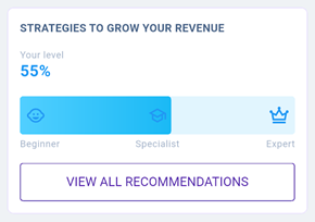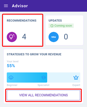 The main page contains the following sections: “Recommendations”, “Updates”, and “Strategies to grow your revenue”.