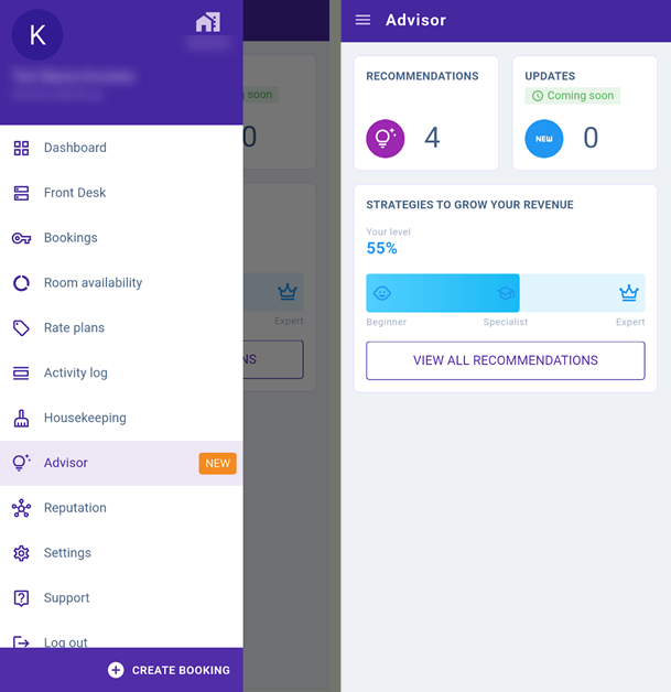 To view recommendations in the Exely Hotelier mobile app, open the side menu and select “Advisor”.