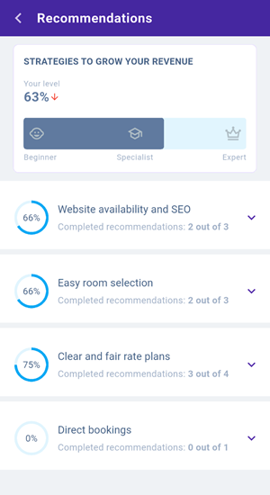 The “Strategies to grow your revenue” section contains a progress bar. The bar shows how the completion percentage of all recommendations in Exely Advisor changes as you address them.