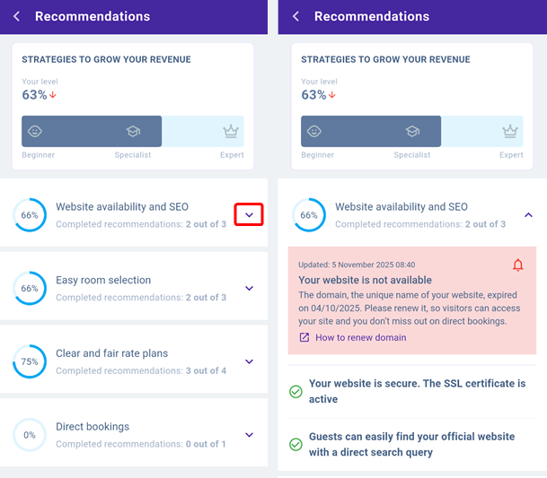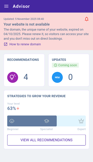 Recommendations highlighted in red indicate critical issues that prevent guests from accessing your website or making a booking.
