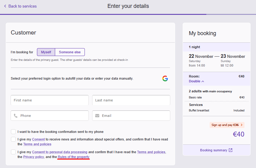By default, the booking engine includes the main documents: “Consent to personal data processing”, “Consent to receive news and information about special offers”, and “Privacy policy”. If necessary, you may replace them with equivalent documents used at your property. The document names will remain standard. “Property rules” are added in addition to the main documents.