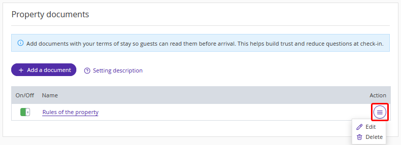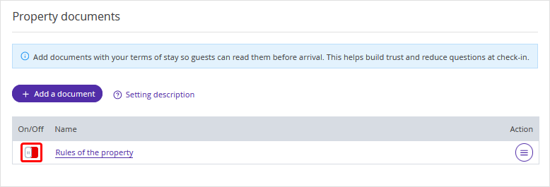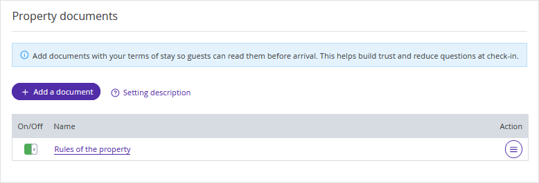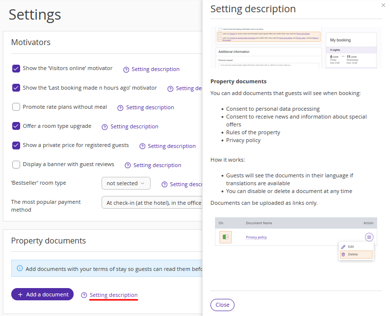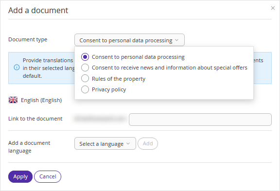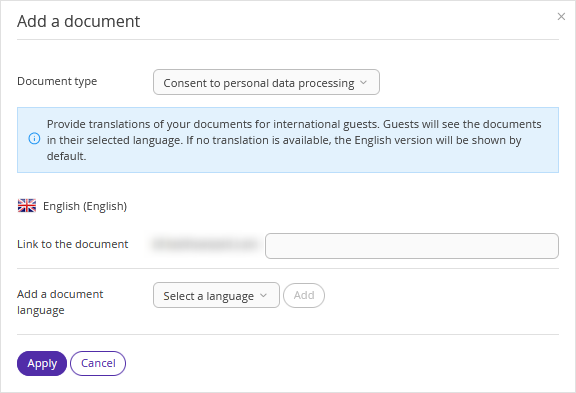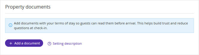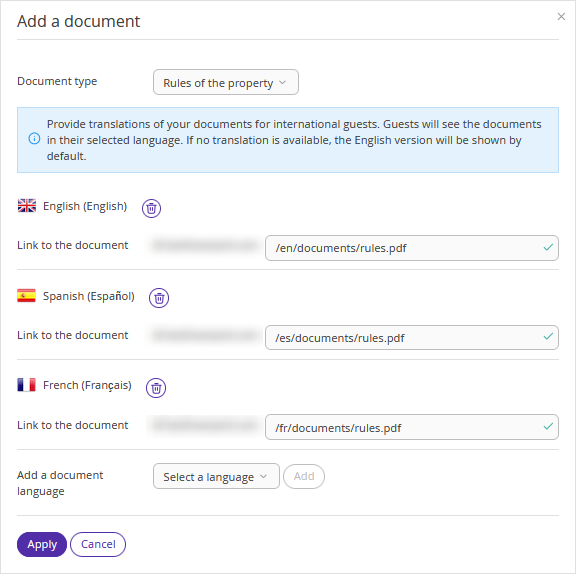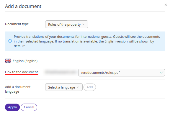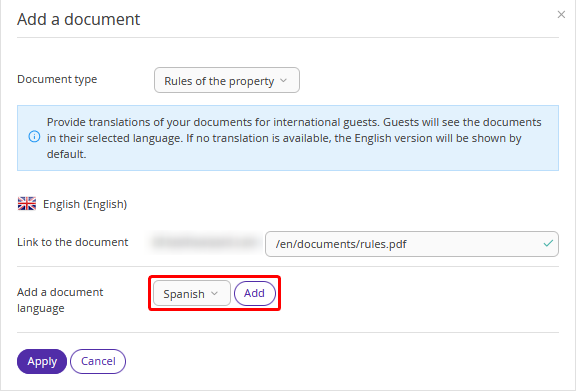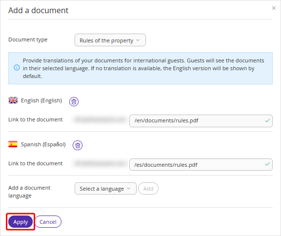 If there is no document for a specific language version of the booking engine, the English version added in the “Property documents” section will be shown instead.