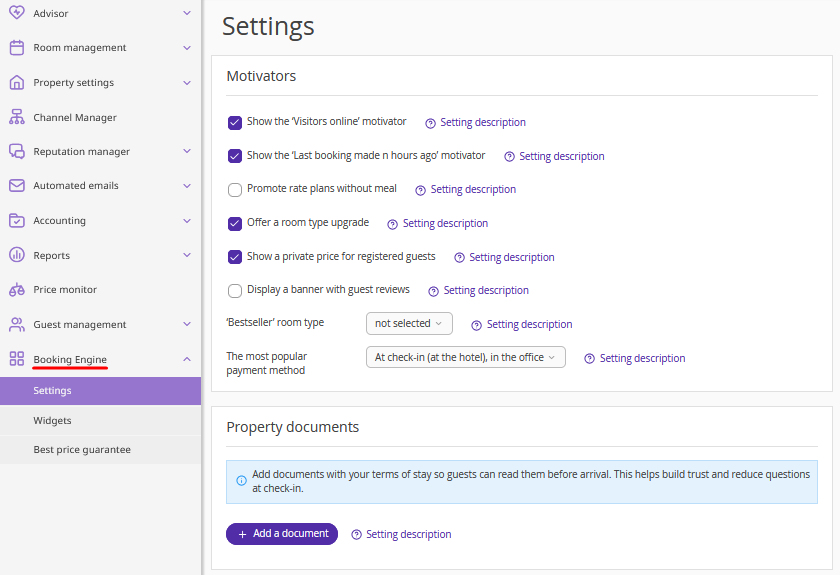 To allow you to upload the necessary documents to the booking engine — for example, rules of the property or consent to receive news and special offers — a new “Property documents” section has been added to the Exely extranet.
