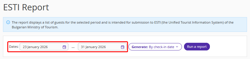 In Exely PMS, the ESTI report has been updated for properties in Bulgaria. The report contains a list of guests for a selected period and is intended for submitting data to ESTI (Unified Tourist Information System).