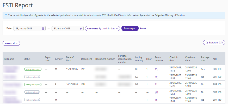 The report can now be exported in CSV format. The exported file complies with the requirements of ESTI and is ready to be uploaded and submitted to ESTI without additional processing. The report includes data only for checked-in bookings.