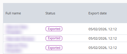 After export, the status of the corresponding entries changes to "Exported", and the export date is shown in the "Export date" column.