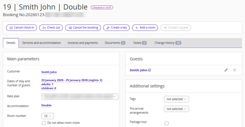 Package tour — you can change the value of this parameter on the booking details page. For this, open a booking on the "Details" tab and tick the "Package tour" checkbox in the "Additional settings" section, if guests are staying on a package tour.