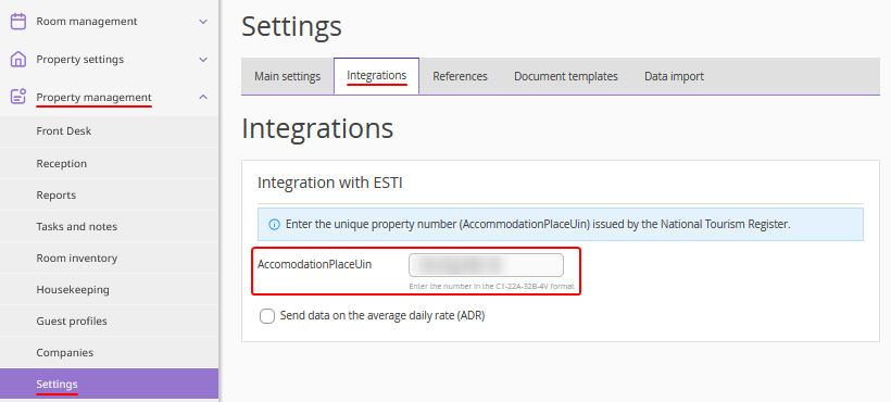 In the "Integration with ESTI" section, in the "AccomodationPlaceUin" field, enter the unique property number issued by the National Tourism Register of Bulgaria.