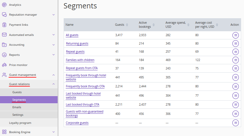 The full list of segments can be found in “Guest management” > “Guest relations” > “Segments”.