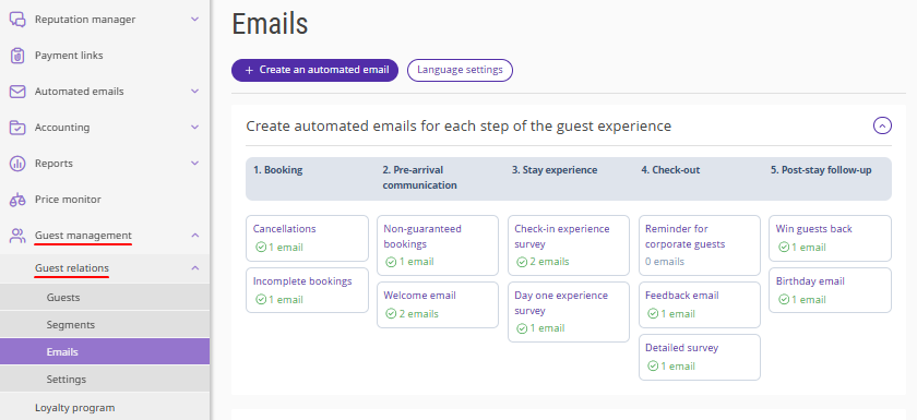 All emails are tied to specific events. They can also be arranged by steps of the guest experience — the sequence of interactions a guest goes through with the property. For more details, refer to the article "How to create automated emails for each step of guest experience".