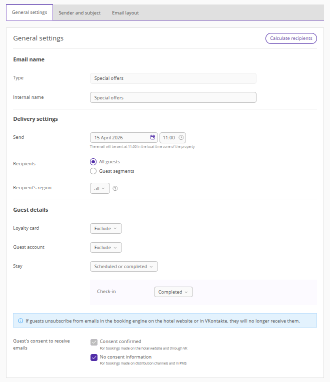 In the Exely extranet, go to "Guest management" > "Guest relations" > "Emails", click "Create an automated email", and select “Special offers”. The "General settings" tab will be opened. For more details on how to create an automated email, see the article "How to create automated emails in Exely Guest Relations".