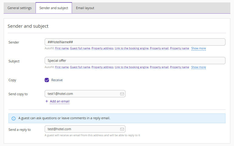 1. On the "Sender and subject" tab, specify the sender, for example, the property or department name. Use variables.